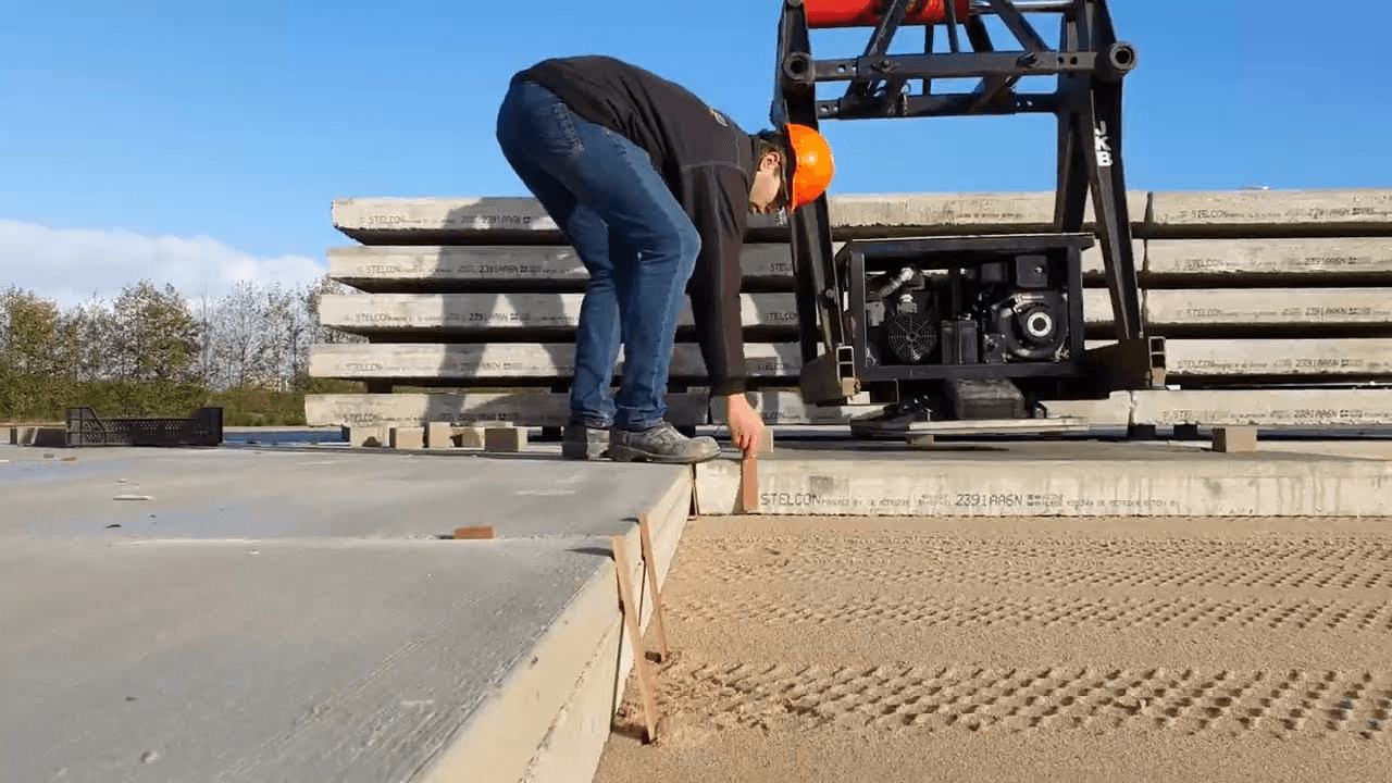 Laat de platen langzaam en horizontaal op het zandbed zakken.